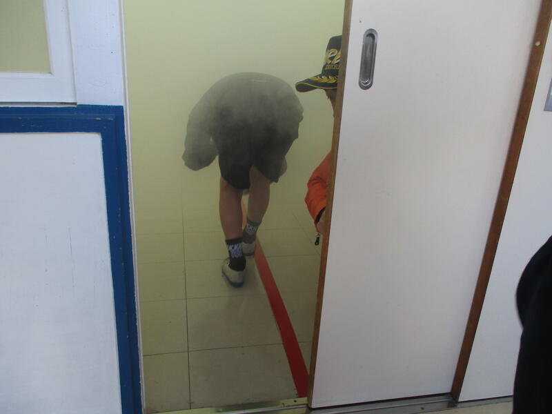 最後に、煙体験をしました。教室に充満した煙の下を、身をかがめて通る体験です。火災の時、自分の身を守るためにも大切なことをここで学びました。