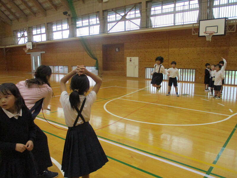 本日(9/28)、1年生教室からは、勢いのある太鼓の音が聞こえました。運動会(11/19)の練習のようです。また、ラジオ体操第一に合わせて体操をする姿も見られました。