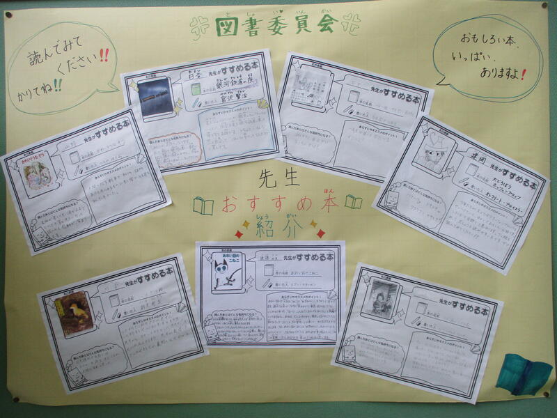 階段踊り場の掲示板には、先生たちのお薦めの本が紹介されています。