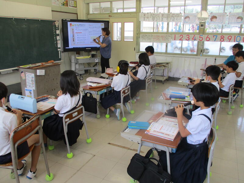 本日(9/6)の1時間目、1年生はタブレットを使った学習を、2年生は“つなぐ言葉”を使った会話の学習を、3年生は“I like 〇〇”を使った外国語学習を、4年生は水生生物探しを、5・6年は学習リーダーを中心にした国語の学習をしていました。みんな、意欲的に学んでいました。