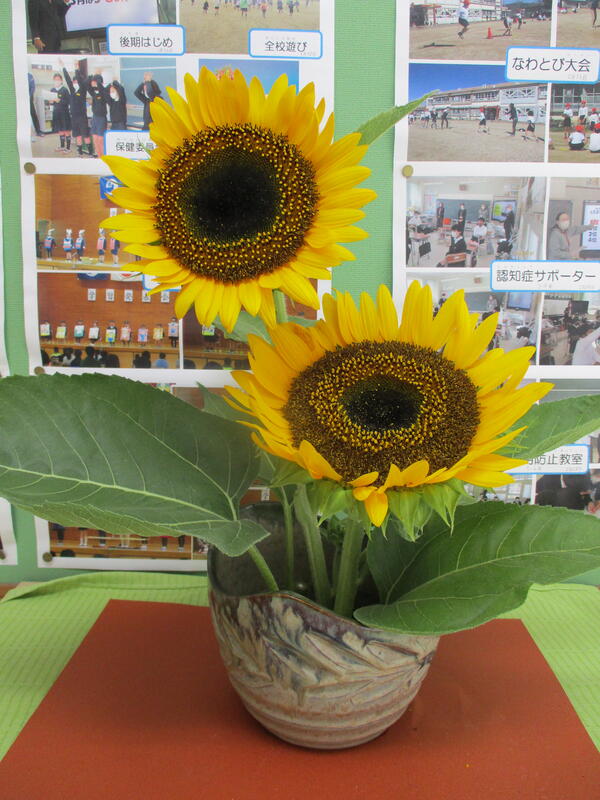 本校の玄関には、ひまわりを生けています。来客された方々は、ひまわりを見て、笑顔になられます。花の力って凄いなと、感じています。