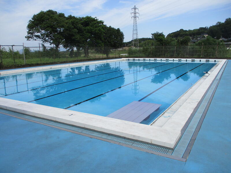 今朝(6/3)のプールです。水を貯めたばかりの綺麗なプールが準備できました。あとは、プール開き(6/7)を待つばかりです。