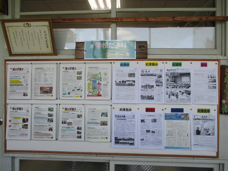 校長室前の掲示板。ここも、子どもたちがよく足を止める場所です。それは、大津町内の学校便りを全て掲示しているからです。本校の“東っ子便り”のお隣に、中学校2校、小学校6校の学校便りがあります。その記事や写真を見ている児童が、毎日数名ですがいます。