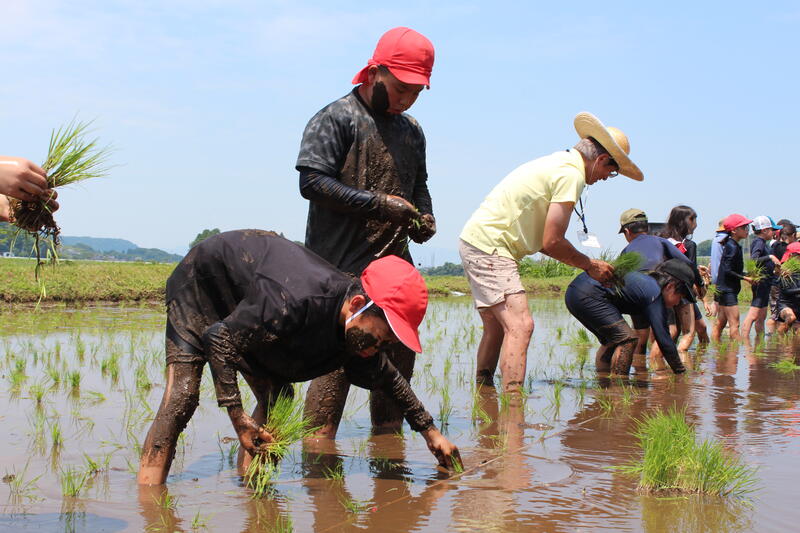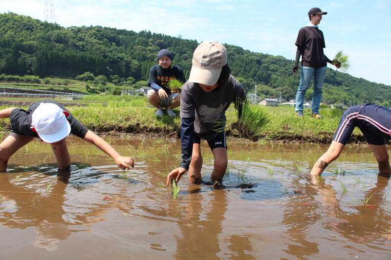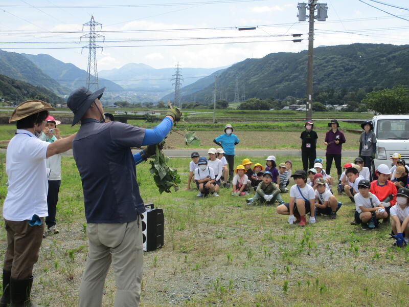 大田黒さんによる説明と実演を見る子どもたちは、真剣そのものでした。そして、実際に棒を使って植えました。