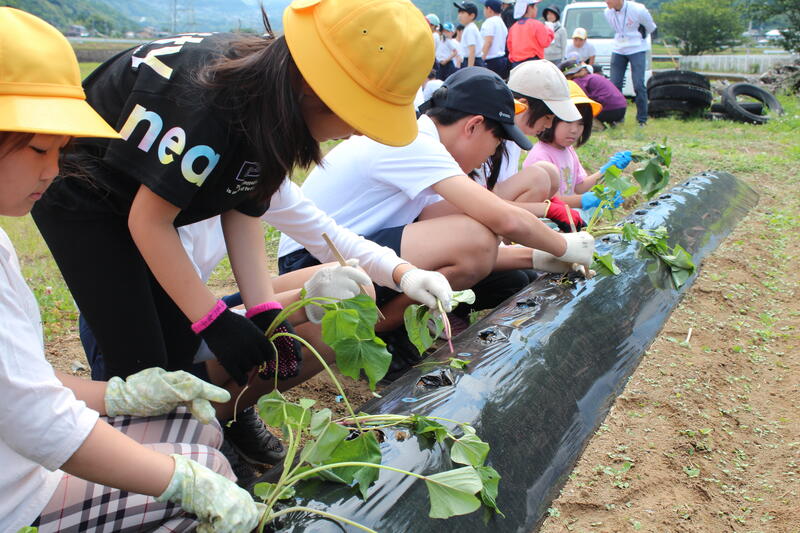 まず、体育館で大田黒さんの紹介などをしました。その後、芋畑に場所を移して、芋植え体験をしました。