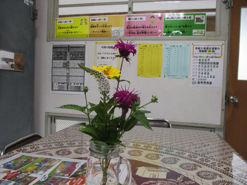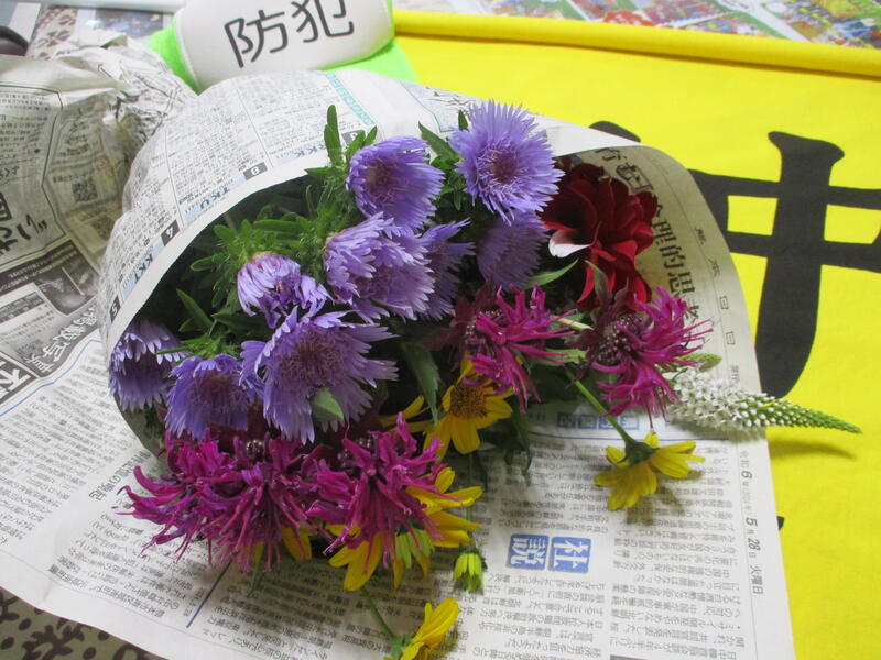 今朝(6/6)、登校指導していただいた小西さん(大林)に、花をいただきました。紫色の江戸紫をはじめ、赤、白、黄色の可憐な花です。その花束を見て、子どもたちも思わず感嘆の声を上げました。