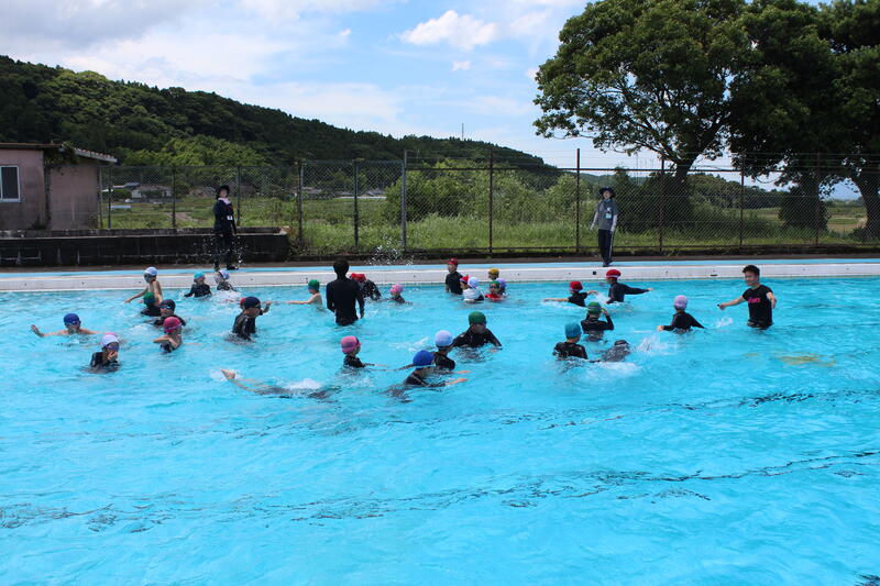 ①塩、②お米、③お酒、④ナスを準備して、順番にお清めをしました。最後にナスがプールに浮いたので、これで安心です。安全にプールを使用して、子どもたちの命を守り、自信を深める学習となるようにします。