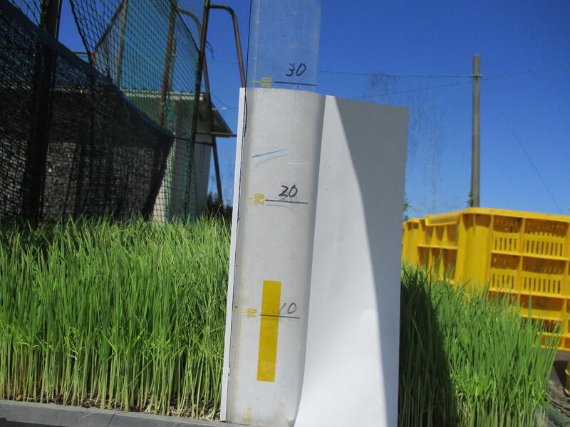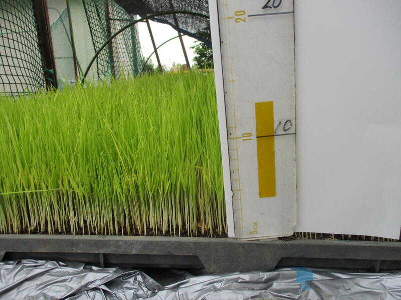 本日(6/3)、餅米の苗を育てているハウスを覗いて見ました。すると、綺麗な苗が順調に育っていました。日が当たらないハウスの中で、黄色い苗が大きく順調に生長しています。