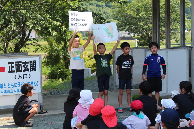 次に、1・2年生から順番に発表をしました。新しい学年になって3ヶ月ほど経ちましたが、子どもたちは色んな経験をしました。そんな一つ一つで自分が考えることを発表しました。発表の後に、次にようなお返しがありました。