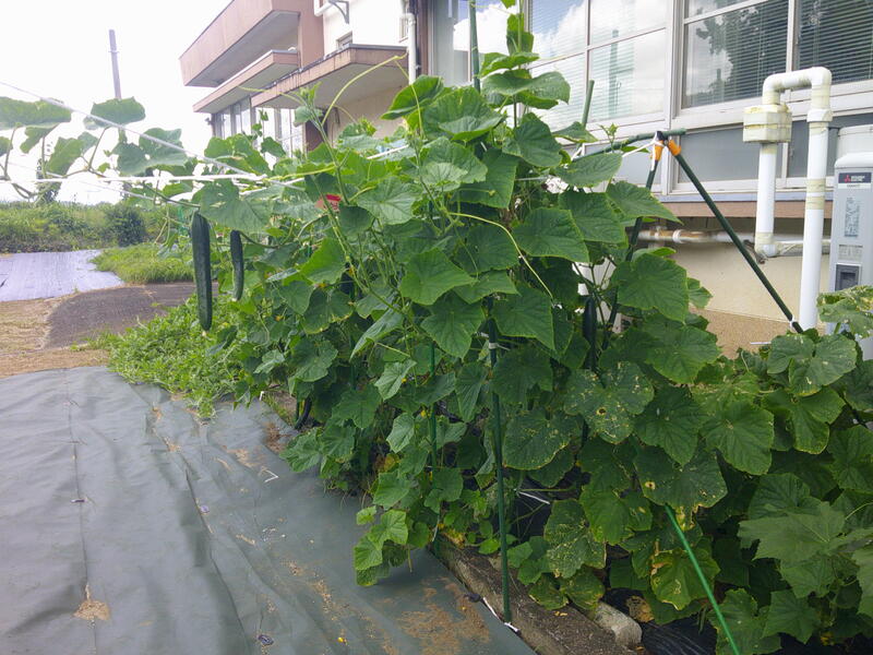 そこには、野菜の当番が作ったポスターも立てられていました。そして、その後ろには大きめのきゅうりなどがなっています。この雨は、野菜などにとって恵みの雨であると感じたところです。