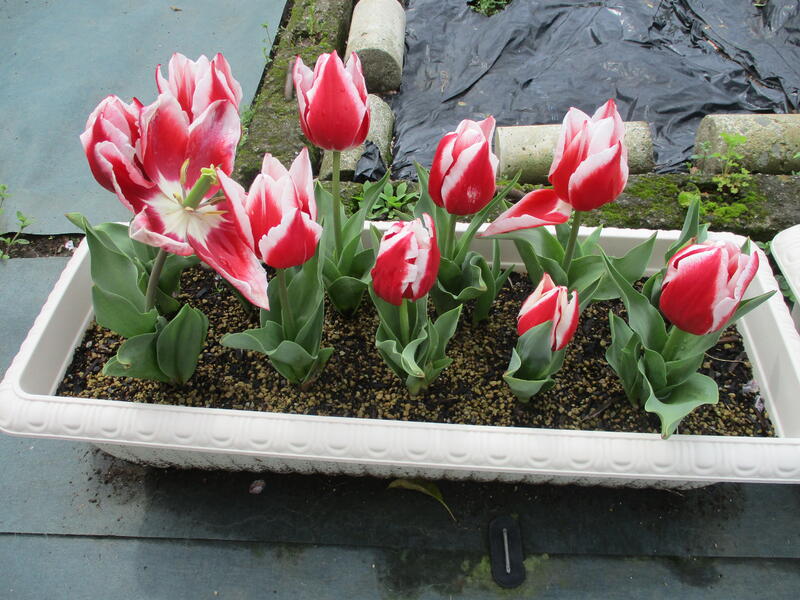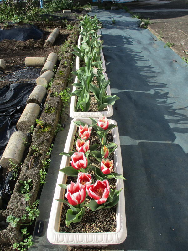 その中でも、チューリップの生長に面白さを感じています。同時に、5種類(色)のチューリップの球根を植えました。しかし、現在咲いているのは赤白混色のものだけです。このように同じチューリップでも生長に違いがあることに、面白さと不思議さを感じたところです。