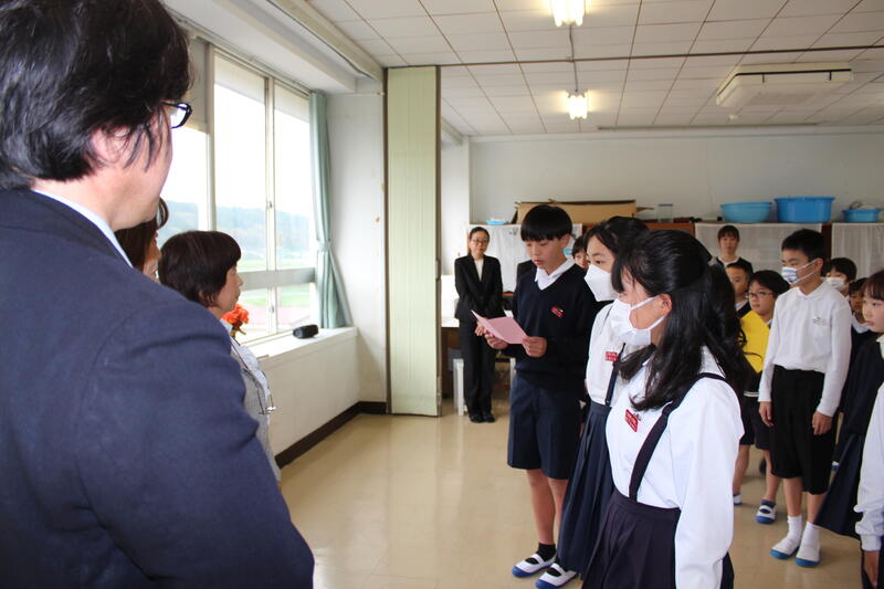 就任式では、転入して来られた3名の先生方から挨拶をいただきました。話を聞いている子どもたちは、身を乗り出していました。そして、代表の小西さんが、立派に歓迎の言葉を述べました。
