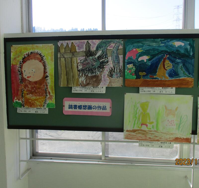 学校の階段踊り場には、先日の読書感想がコンクールの作品が展示されています。どの絵も、本の世界を楽しんで描いたことが分かります。みなさん、よく頑張りました。