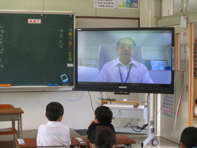 子どもたちは、電子黒板に見入り、しっかり聞いていました。