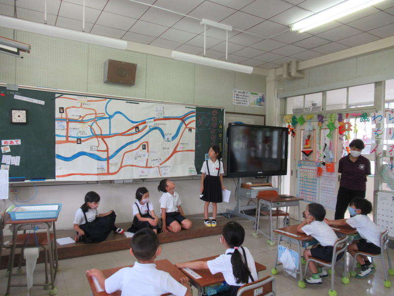 1,2年生では地域の学校応援団の皆様にお世話になり、校区探検を行っています。7月28日には、2年生が1年生にこれまでの取組を発表しました。