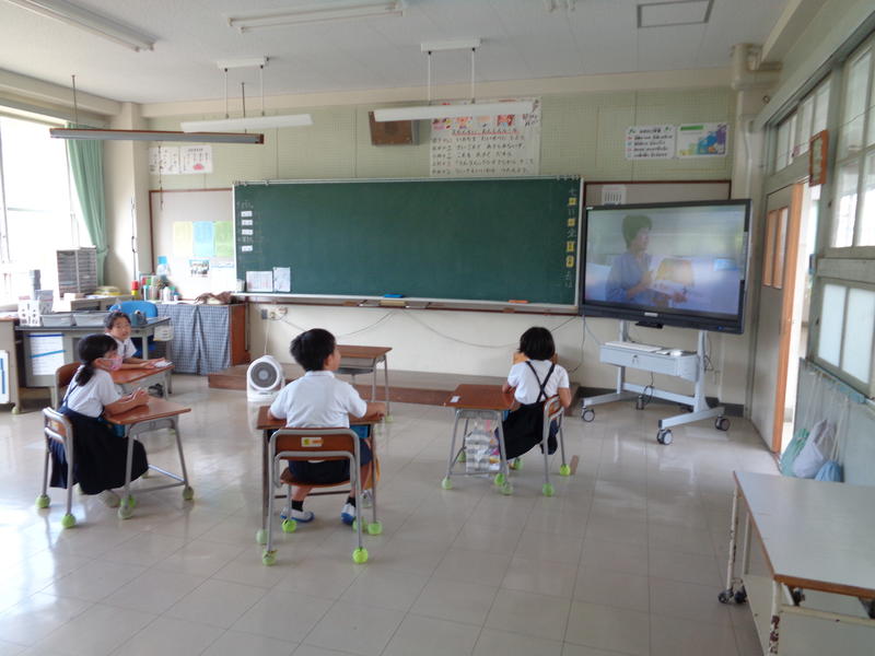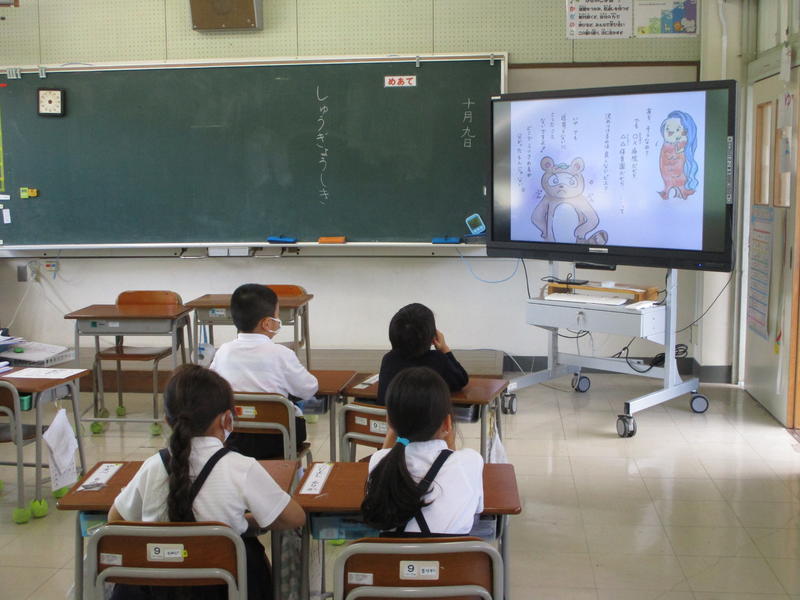 子どもたちは、電子黒板に見入り、しっかり聞いていました。