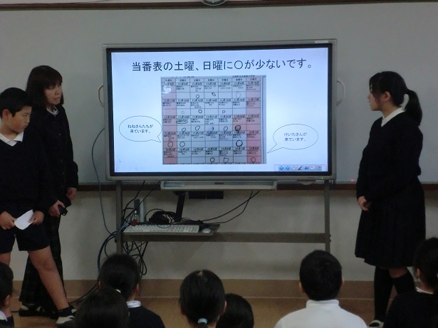 次に、飼育当番についてのアンケート結果発表を行い、飼育当番を忘れないように、また都合でできないときは、誰かに代わってもらうようお願いしました。
