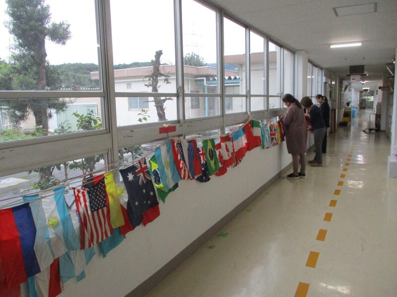 運動会の雰囲気を盛り上げる万国旗。今朝(11/1)、5年生が準備をしてくれました。まつぼり風に耐えながら会場を盛り上がる大切な万国旗です。風で外れないように、先生方に結び直していただきました。