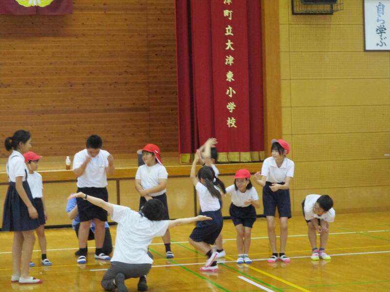 エア長縄跳び、早口言葉、詩の朗読など楽しんだ後に、縦割り班ごとにジェスチャーでいろんな「お店」を表現しました。