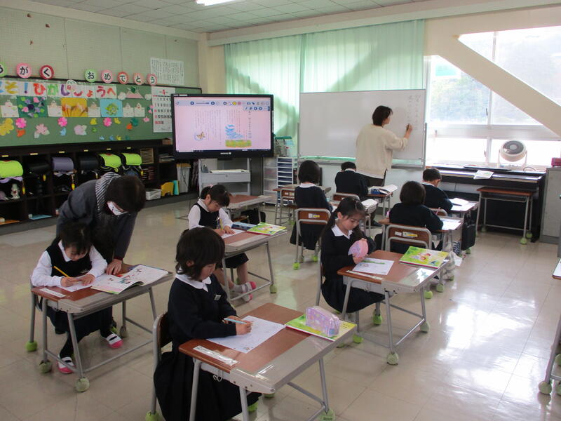 本日(4/11)の1時間目に、1・2年生は国語の学習をしていました。1年生も2年生も初めての複式授業ですが、担任の後藤先生が学習支援指導員の春木先生と連携して、上手に指導されていました。
