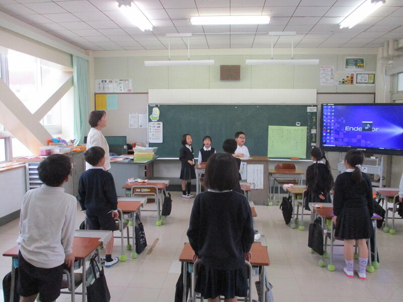 本日(4/25)、3年生は外国語活動の学習をしていました。3年生から始まる授業です。子どもたちはとても楽しそうに、挨拶などの練習をしていました。