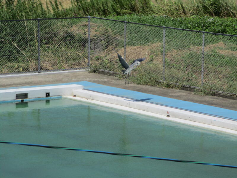 本日(9/9)8時頃、プールサイドにアオサギを発見しました。
