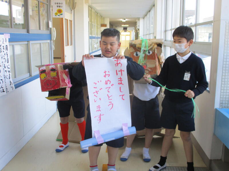 本日(1/9)昼休みに、ひまわり2教室で“獅子舞”と“牛舞”がやってきました。お正月の厳粛な音楽が流れ、教室が舞台となります。