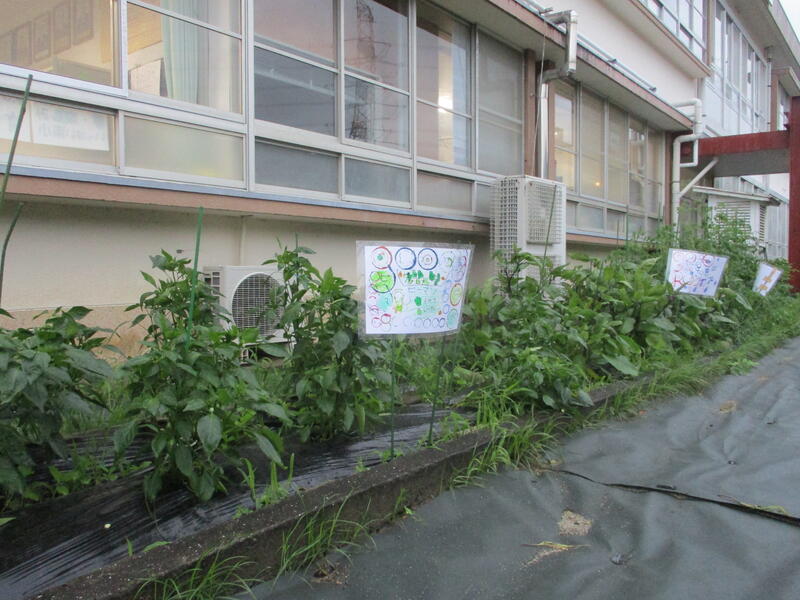 そこには、野菜の当番が作ったポスターも立てられていました。そして、その後ろには大きめのきゅうりなどがなっています。この雨は、野菜などにとって恵みの雨であると感じたところです。