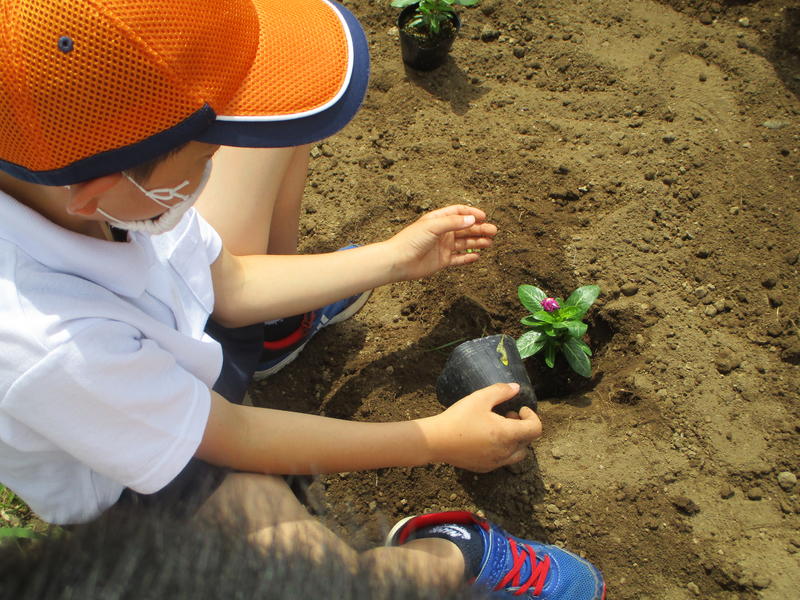6月5日(金)に、学級花壇にニチニチソウとアリッサムを植えました。それぞれの学級の花壇にみんなで植えました。