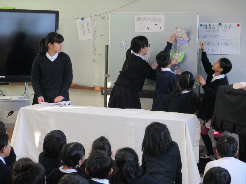 12月10日(火)8:25~8:40で、図書委員会による児童集会を行いました。ペープサート(紙芝居劇)による「おむすびころりん」の読み聞かせでした。ペープサートを休み時間などに作ったり、台詞を覚えたり、図書委員会は、よく頑張りました。新しい本の紹介もしました。すばらしい発表でした。
