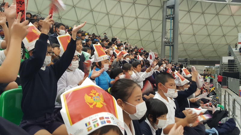 本校は、モンテネグロの応援校としてエールを送りました。近くで見る世界レベルのハンドボールに目を輝かせていました。