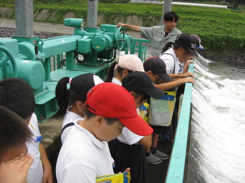 4年生の総合的な学習の時間では、学校田に流れてくる水がどこからくるのかを調べています。今週は、上井手をさかのぼり、白川の取水口を見学しました。おおきく土地改良区の方に特別に取水ゲートを開けてもらうと、水流が変わり、ゴーッという水の迫力に子どもたちは圧倒されていました。ふだん見慣れている井手の役割や土地改良区の方々のお仕事について学ぶことができました。
