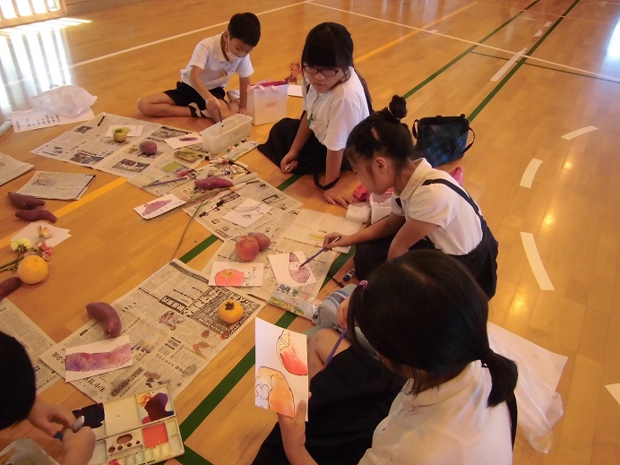 もう1枚は、秋の草花や果物を題材にしたはがき絵で、大津町のふくし祭り会場に飾られます。ご都合がつくご家庭は、子どもたちの作品を見に行かれてください。