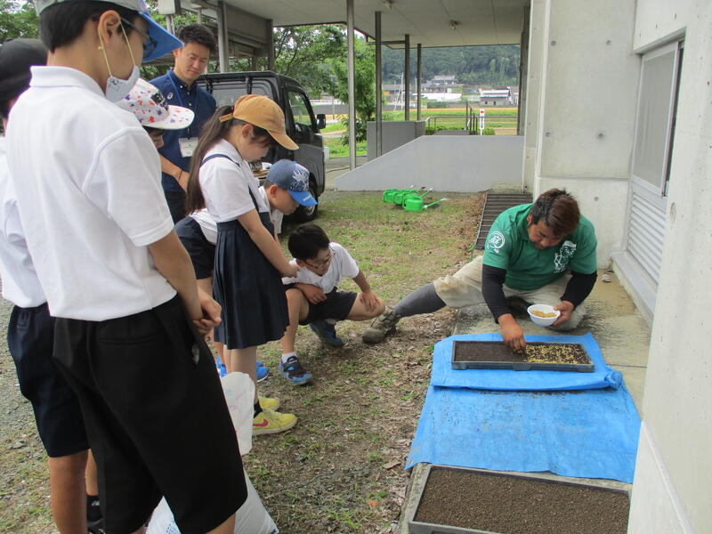本日(5/22)、5年生は内村さんのご指導のもとで、種まきと苗作りをしました。