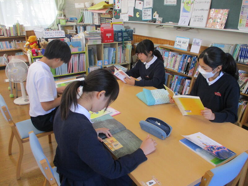 また、6年生は図書室で国語の学習をしていました。読み聞かせや意味調べ、短文づくりなどを行った後、国語科授業の関連図書を読んだり図書を借りたりしました。