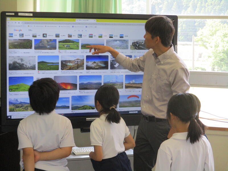 子どもの発表を受けて、中岳の湯だまりなど、その魅力を説明していた先生。子どもたちはとても楽しそうに学んでいました。