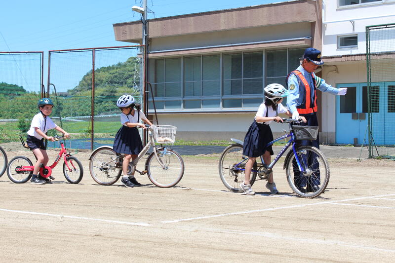 本日(5/14)、3年生以上の子どもたちは、自転車教室も実施しました。ここでは、大津町交通安全指導隊(6名)をお招きして、指導いただきました。