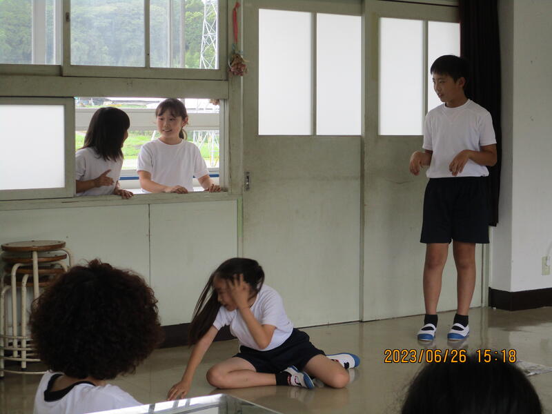 昨日(6/25)、劇団きらら(代表:池田さん)の5名の方々をお迎えして、3年生以上の児童は演劇ワークショップを体験しました。