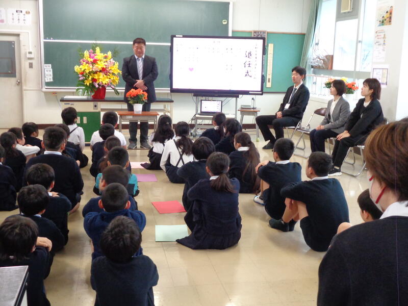 本日(3/26)、退任式をしました。4名の先生方が、新天地に異動されることとなりました。そこで、多くの子どもたちとPTAの方と一緒に式を実施しました。
