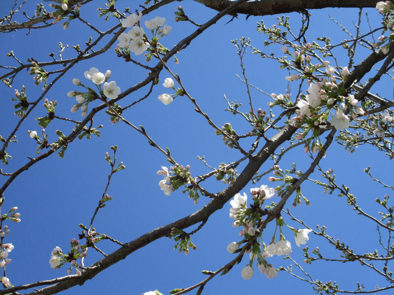 本日(3/27)、本校の桜を見てみると、なんと20輪ほど桜の花が咲いていました。5輪以上の花を付けると“開花”と言うそうです。本校の桜も開花しました。