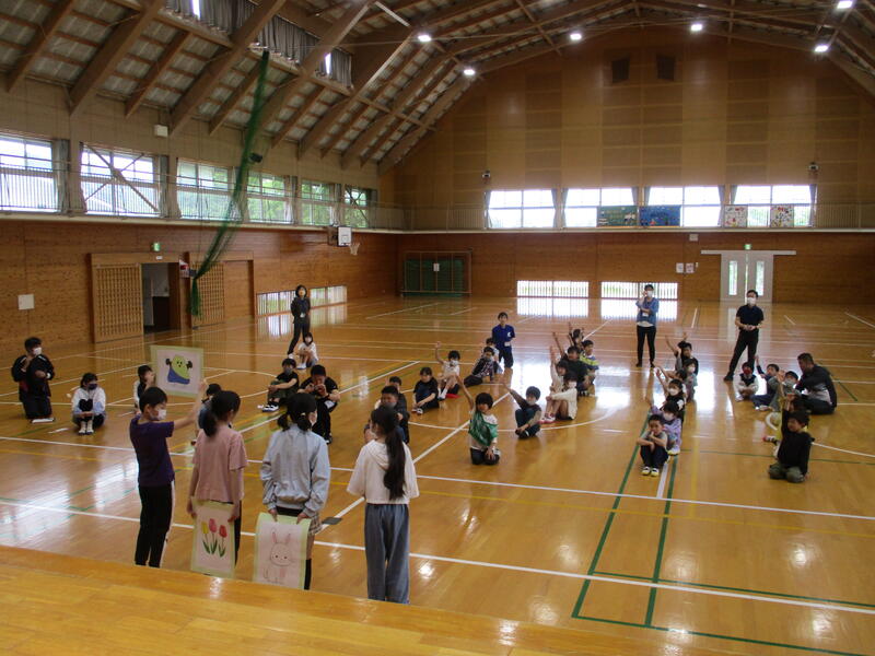 まず、体育館での歓迎会でした。1年生6名の子どもたち、そして本年度転入いただいた3名の先生方をお迎えする大切な会です。1年生は、自己紹介や意気込みを発表しました。緊張した面持ちでしたが、しっかりと発表できました。そして、5・6年生が考えた“シルエットクイズ”や“ジャンケン列車”“縦割り班対抗の花いちもんめ”などのゲームを行い、みんなで楽しみました。ジャンケン列車では、1年生のこうきさんが見事優勝して車掌さんを務めてくれました。