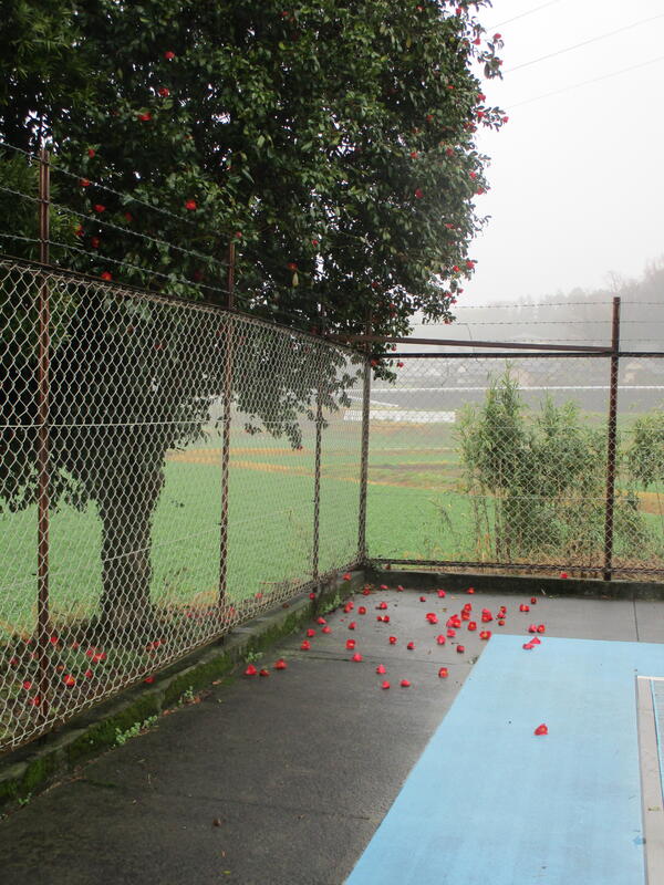 さざんか並木 プール横に咲き、散っていく椿
