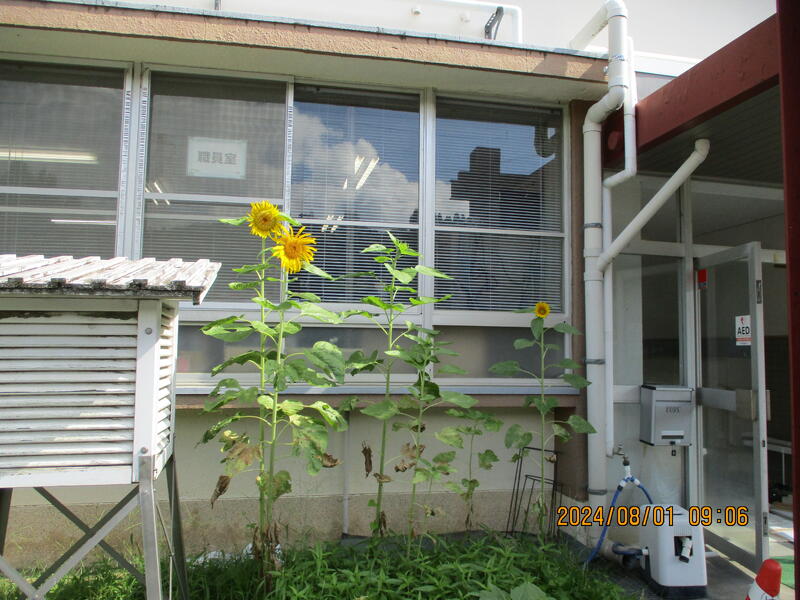 学校の草花も大きく成長しています。玄関前のひまわりは花を付けています。また、みんなで児童玄関前に植えたひまわりも、8月末には咲くことと思います。楽しみにしておいてください。