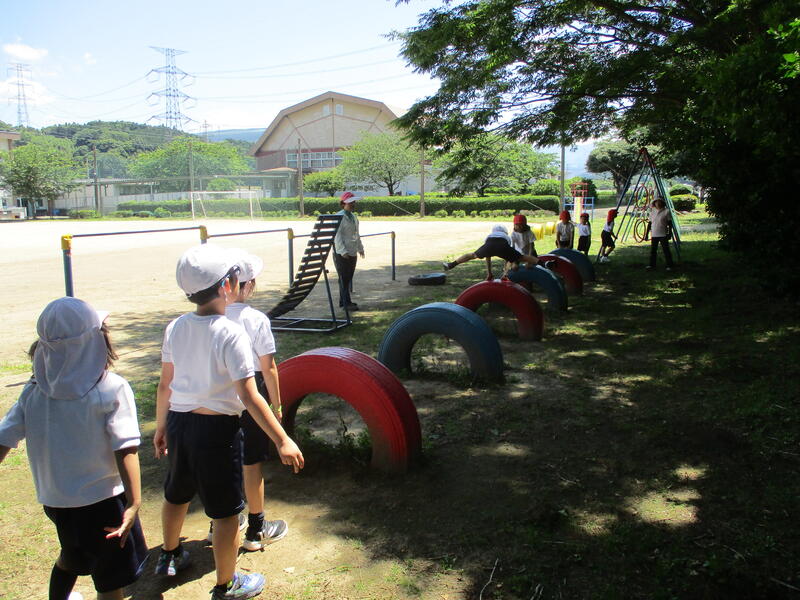 本日(6/4)の授業の様子です。1・2年生は、運動場の様々な遊具を楽しむサーキットを行っていました。タイヤ跳びはとても盛り上がっていました。しかし、鉄棒については個人差があるようでした。しばらく見ていると、