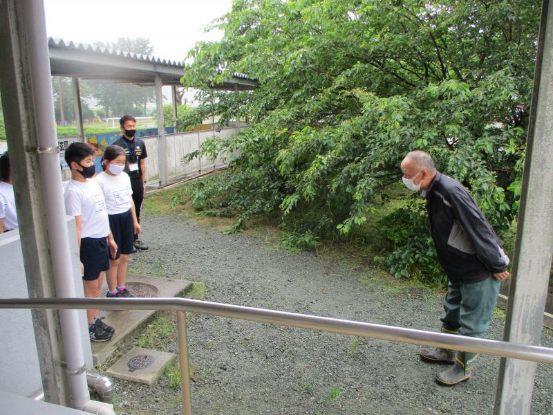 プールは、使っていない間に堆積物が底に詰まり、毎回、掃除が大変でした。その大変さを学校運営協議会の委員であり地域コーディネーターの内村勇治さんに相談すると、大津町消防団第1分団に協力いただくことができました。分団長の阪田英二さんに消防車で当日来ていただきました。内村さんは、高圧洗浄機で、阪田さんは、消防ホースできれいにしてくれました。大変ありがとうございました。