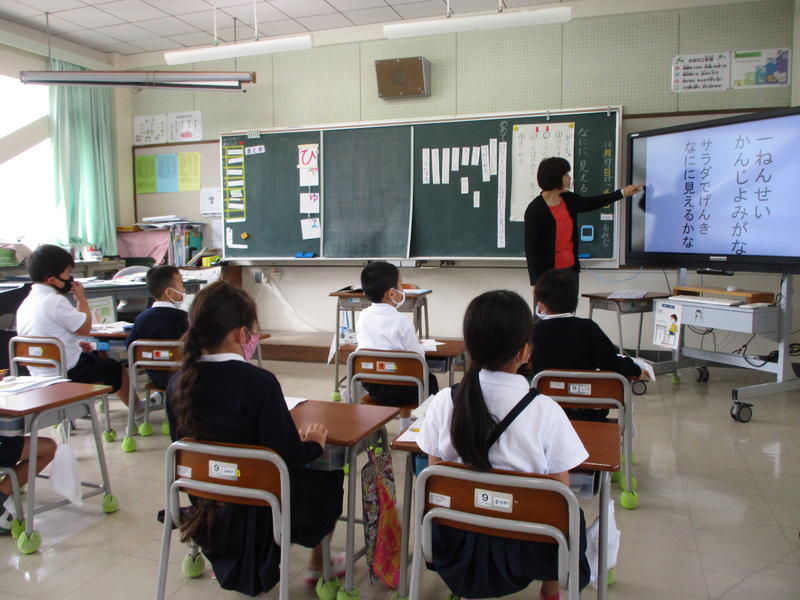 11月10日(火)1校時、3,4年と5,6年の複式授業。どちらも電子黒板やタブレットを活用して効果的な授業を行っています。