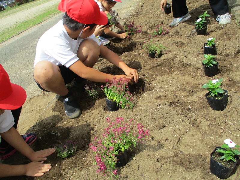 6月5日(金)に、学級花壇にニチニチソウとアリッサムを植えました。それぞれの学級の花壇にみんなで植えました。