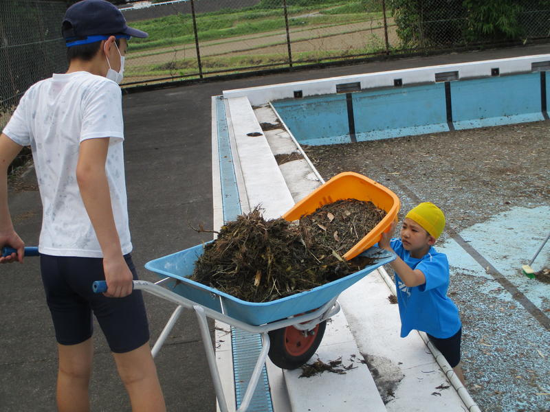午後からは、3年生から6年生でプール掃除。溜まったゴミを集め、捨てました。早くきれいになったプールで泳ぎたいですね。