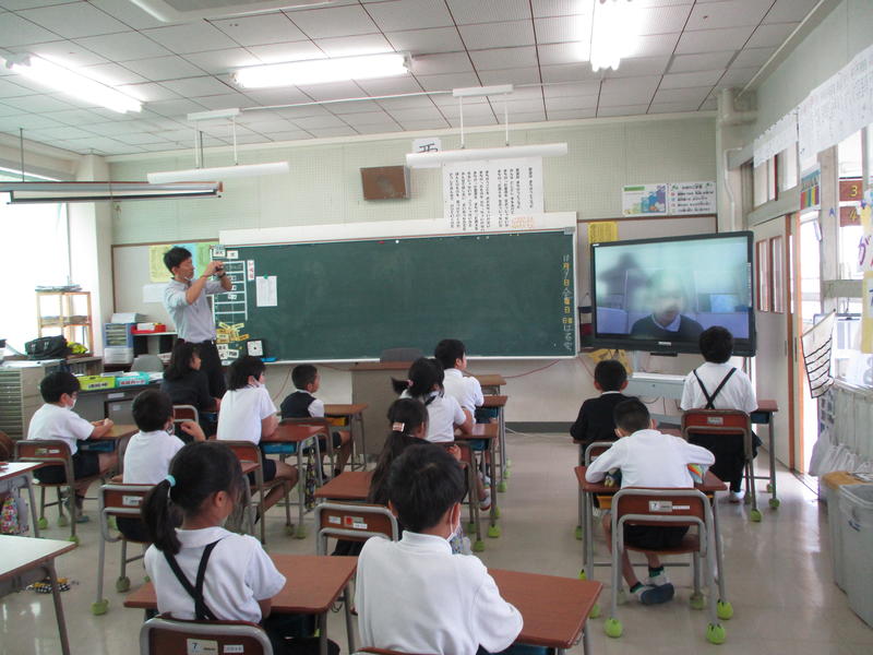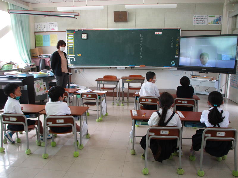 子どもたちは、電子黒板に見入り、しっかり聞いていました。