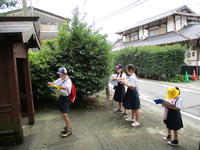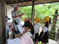 吹田探険 吉岡区長さん 吉岡カヨ子さんが案内してくださいました。6年生と一緒に探険しました。1,2年生は吹田神社と、以前神社があったところ(古宮)、地蔵堂を探険しました。